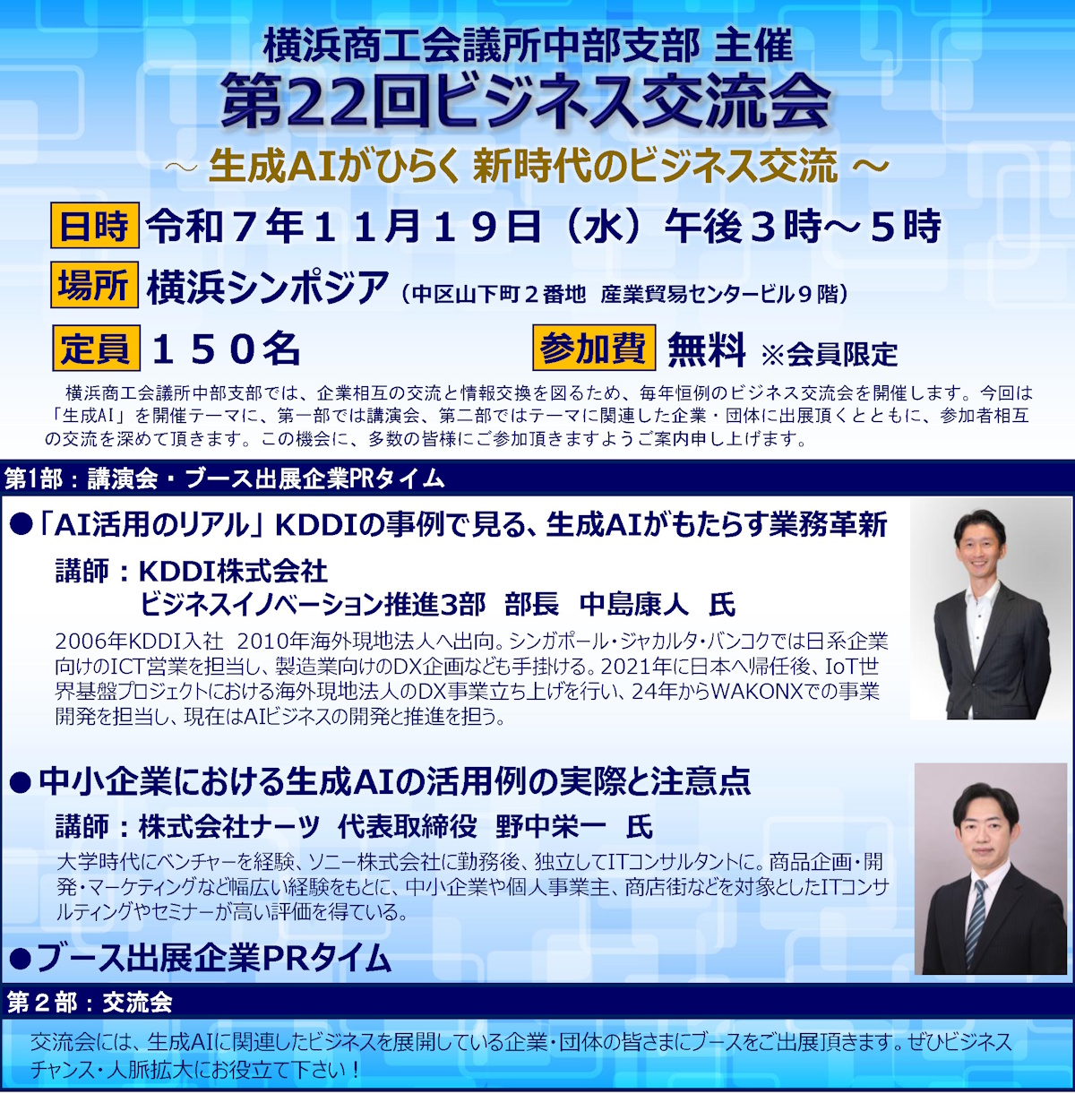 横浜商工会議所中央支部では、企業間の交流と情報交換を目的に毎年「ビジネス交流会」を開催しています。今年度は「生成AI」がテーマとなり、第一部では講演会、第二部では関連企業・団体による展示および参加者同士の交流が行われました。